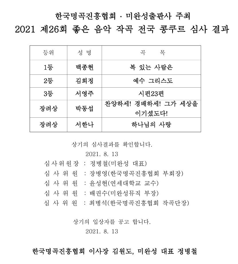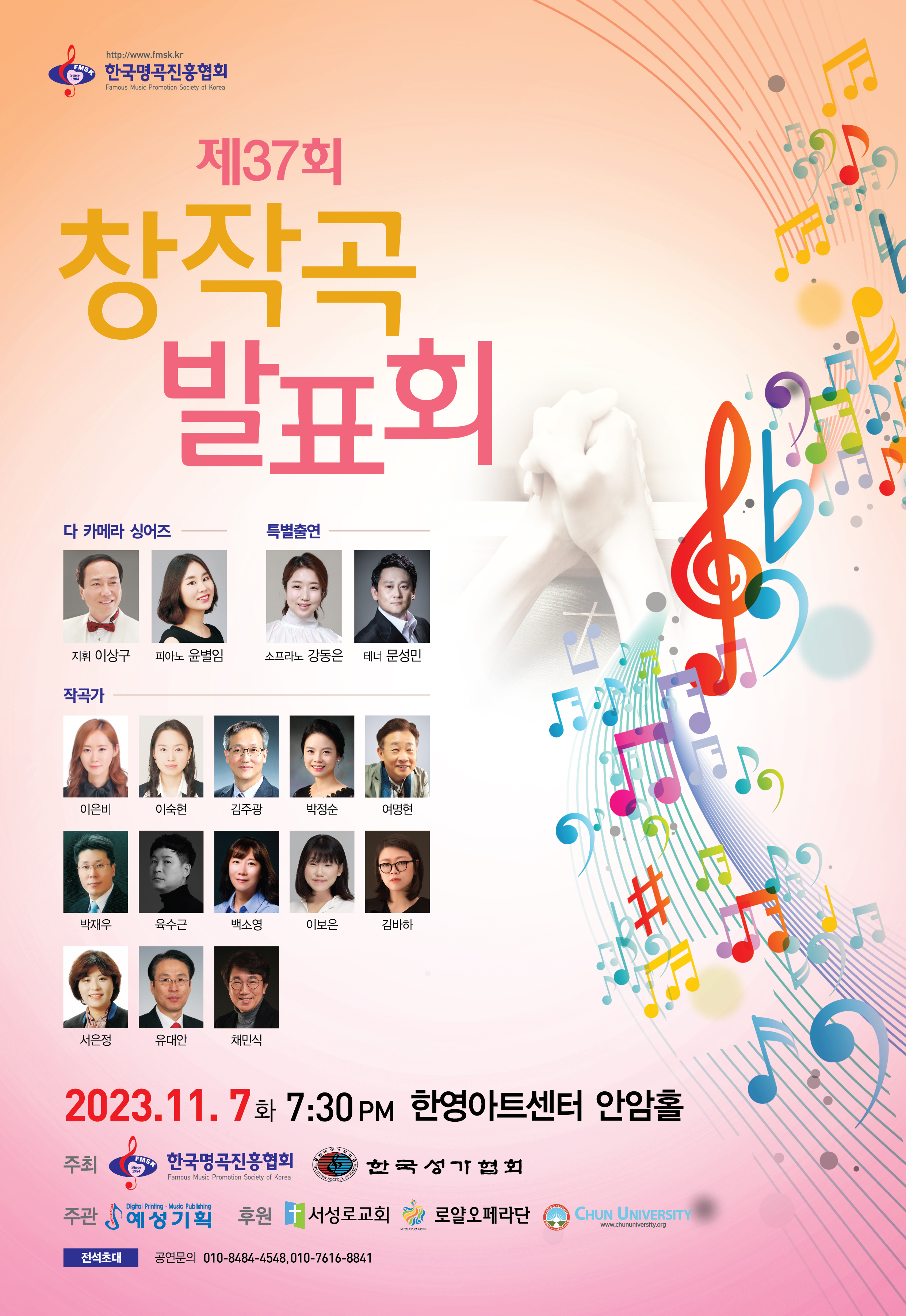일시: 2023년 11월 7일(화) 19:30pm 장소: 한영아트센터 안암홀 작곡가: 이은비, 이숙현, 김주광, 박정순, 여명현, 박재우 육수근, 백소영, 이보은, 김바하, 서은정, 유대안, 채민식 합창단: 다 카메라 싱어즈(지휘: 이상구, 피아노: 윤별임) 독창 : 소프라노 강동은, 테너 문성민 실황영상(합창) https://youtu.be/qgYF_0xNGlQ?si=FheoWD0Idp_kU0I7 한국명곡진흥협회와 한국성가협회 주최, '제37회 창작 성가곡 발표회' 열어(11월 8일 CBS뉴스)
